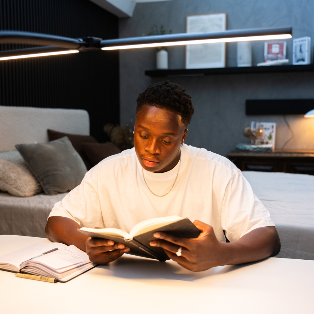 Lampen har 24W LED-lys med dobbelt hoved – det giver kraftig, jævn belysning, perfekt til både arbejde og studier.
