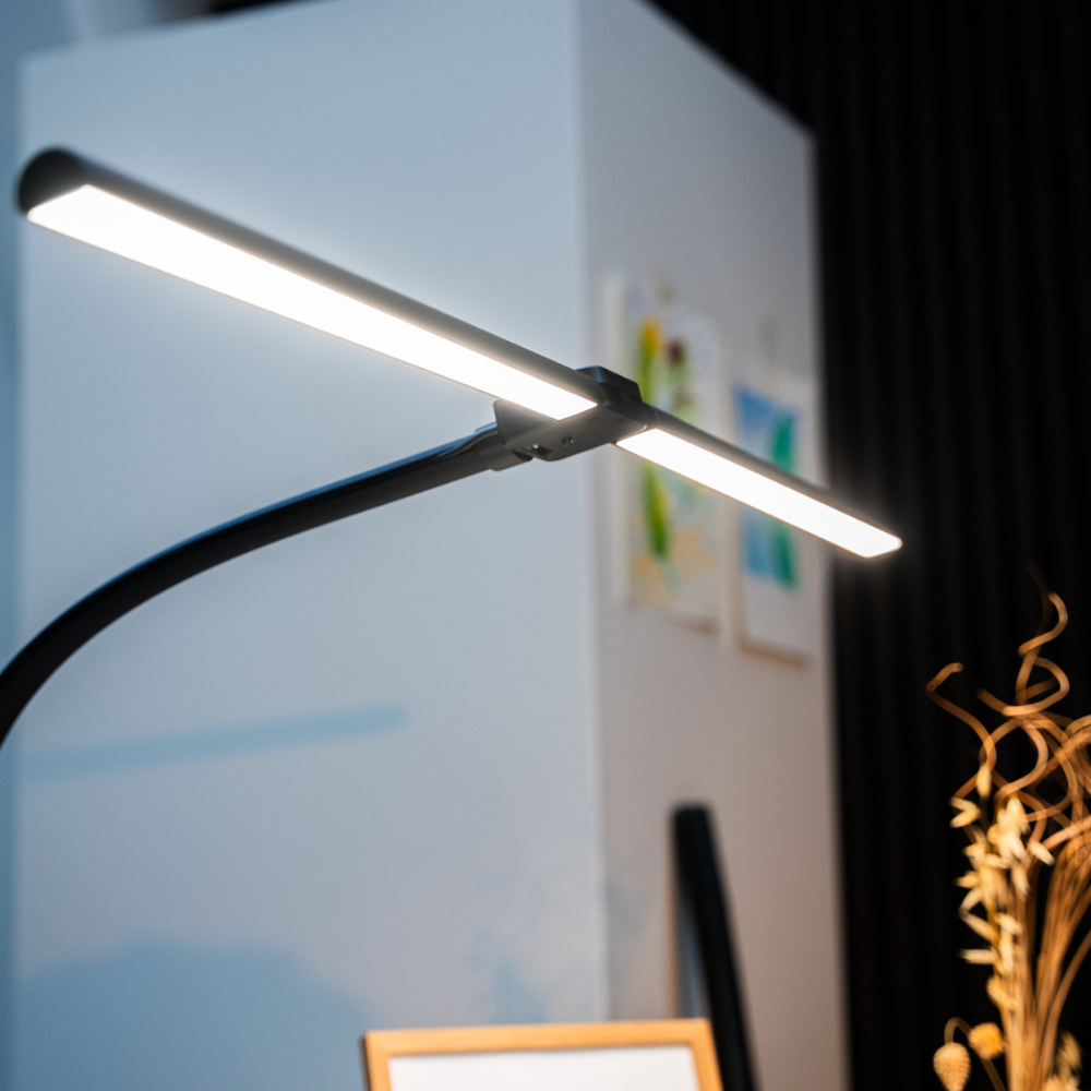 Lampen har 24W LED-lys med dobbelt hoved – det giver kraftig, jævn belysning, perfekt til både arbejde og studier.